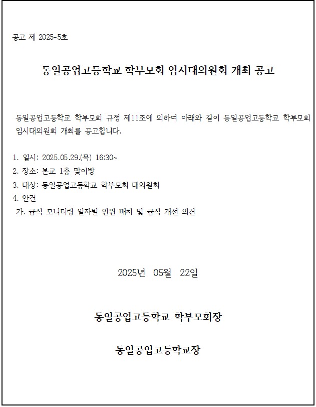 2025Çг⵵ µ¿Àϰø¾÷°íµîÇб³ Çкθðȸ ÀӽôëÀÇ¿øÈ¸ °³ÃÖ °ø°íÀÔ´Ï´Ù.
